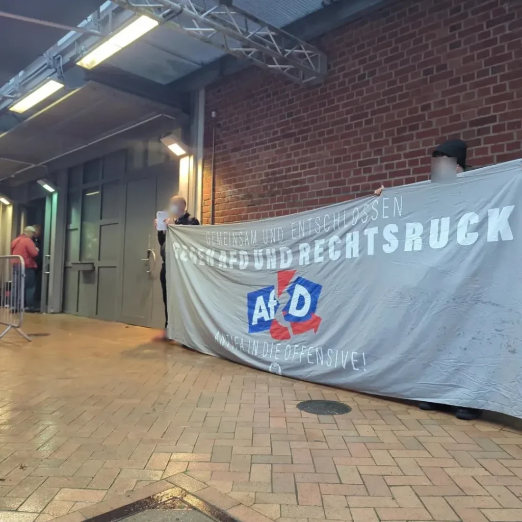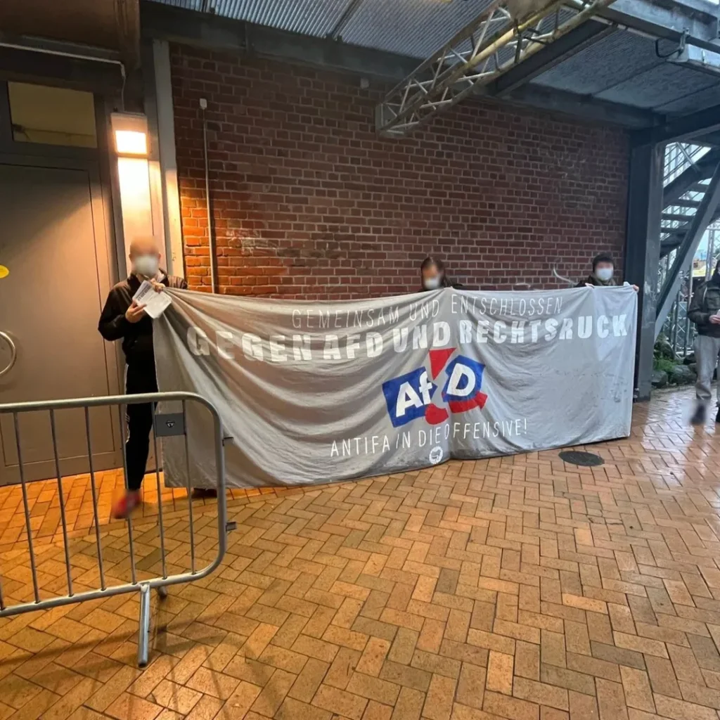 Gestern Abend waren acht Antifas vor der Halle 400 zum Oberbürgermeister*innen-Talk in Kiel. Unter den Kandidat*innen befand sich auch Hubert Pinto de Kraus, als Vertreter für die AfD. Sie stellten sich mit einem Banner neben den Eingang und verteilten Flyer, um ein klares Zeichen gegen die AfD zu setzen. Zudem haben sie überwiegend positive Interaktionen gehabt und viel Zuspruch bekommen. Kurz vor Beginn der Veranstaltung trafen immer mehr Cops ein, die wieder einmal auf absurde Weise den Protest schikanierten und die Aktion löste sich auf.