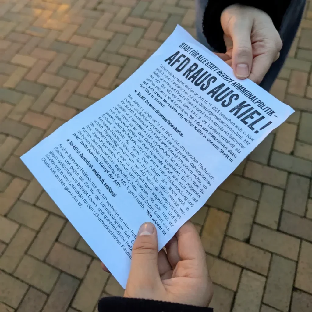 Wir rufen alle Kieler:innen dazu auf, sich dieser Normalisierung rechter Kräfte in unserer Stadt in den Weg zu stellen!