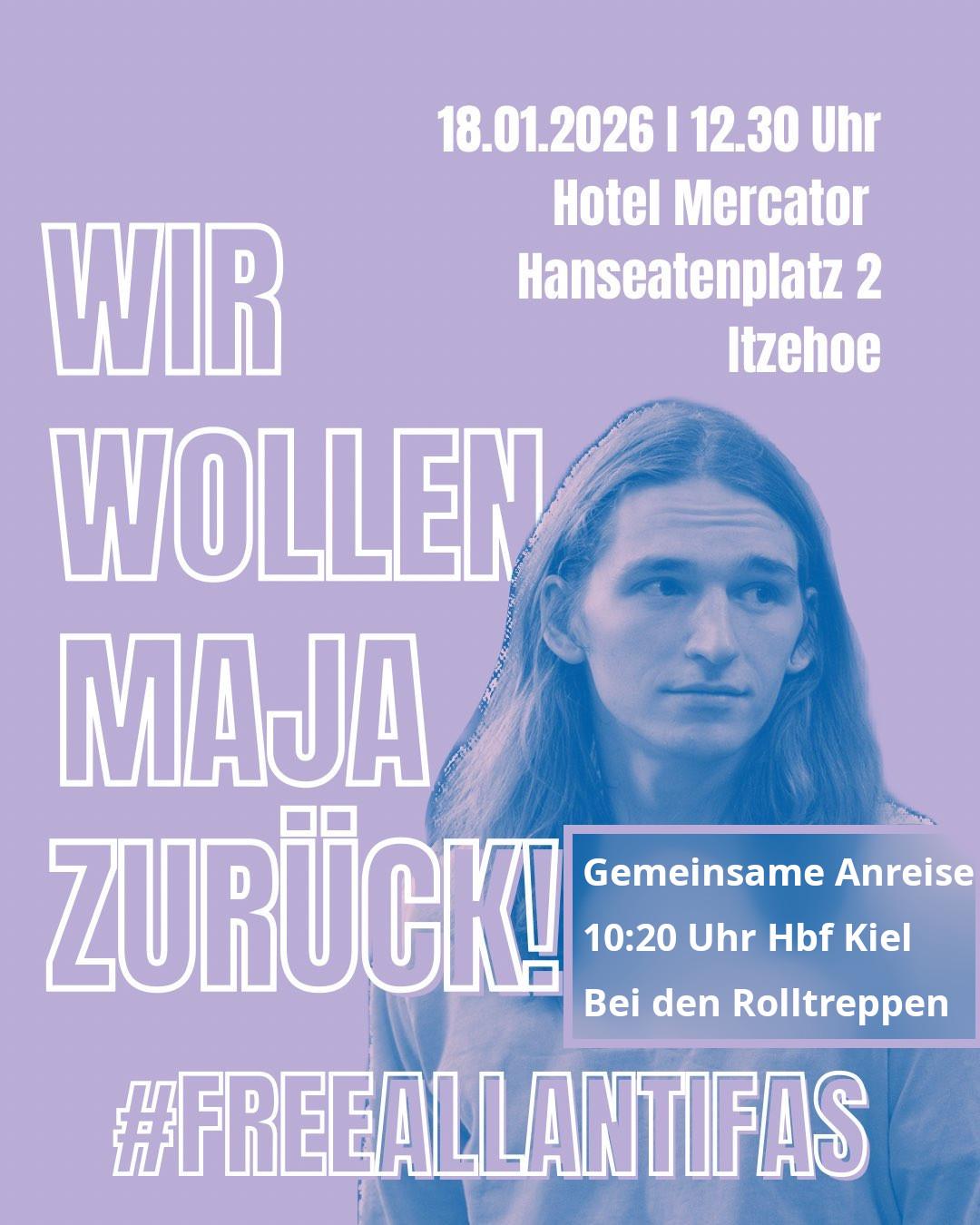 „Am 22.01.2026 wird in Budapest das Urteil im Prozess gegen die dort angeklagten Antifaschist:innen erwartet, denen vorgeworfen wird, vor drei Jahren beim „Tag der Ehre“ militant gegen Neonazis vorgegangen zu sein. Im Rahmen des internationalen Aktionstages in der Woche zuvor rufen wir deshalb zu einer Kundgebung beim CDU-Neujahrsempfang in Itzehoe auf. Denn dort wird auch niemand Geringeres als der deutsche Außenminister Johann Wadephul teilnehmen. Vor allem er ist es gewesen, in dessen amtlicher Verantwortung es gelegen hätte, Druck auf die ungarischen Behörden auszuüben, um Maja aus der Budapester Gefängnishölle zu befreien und nach Hause zurück zu holen.