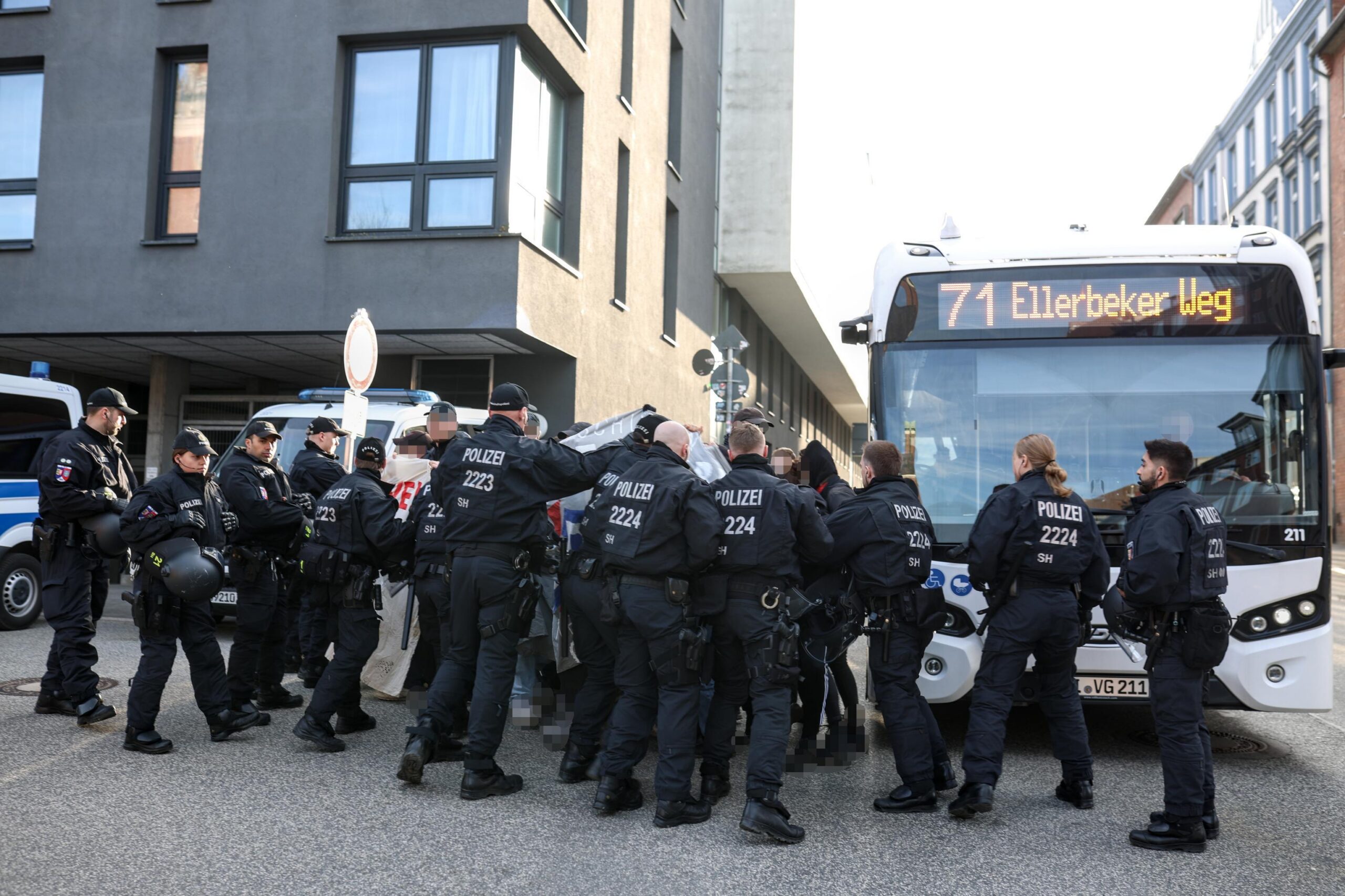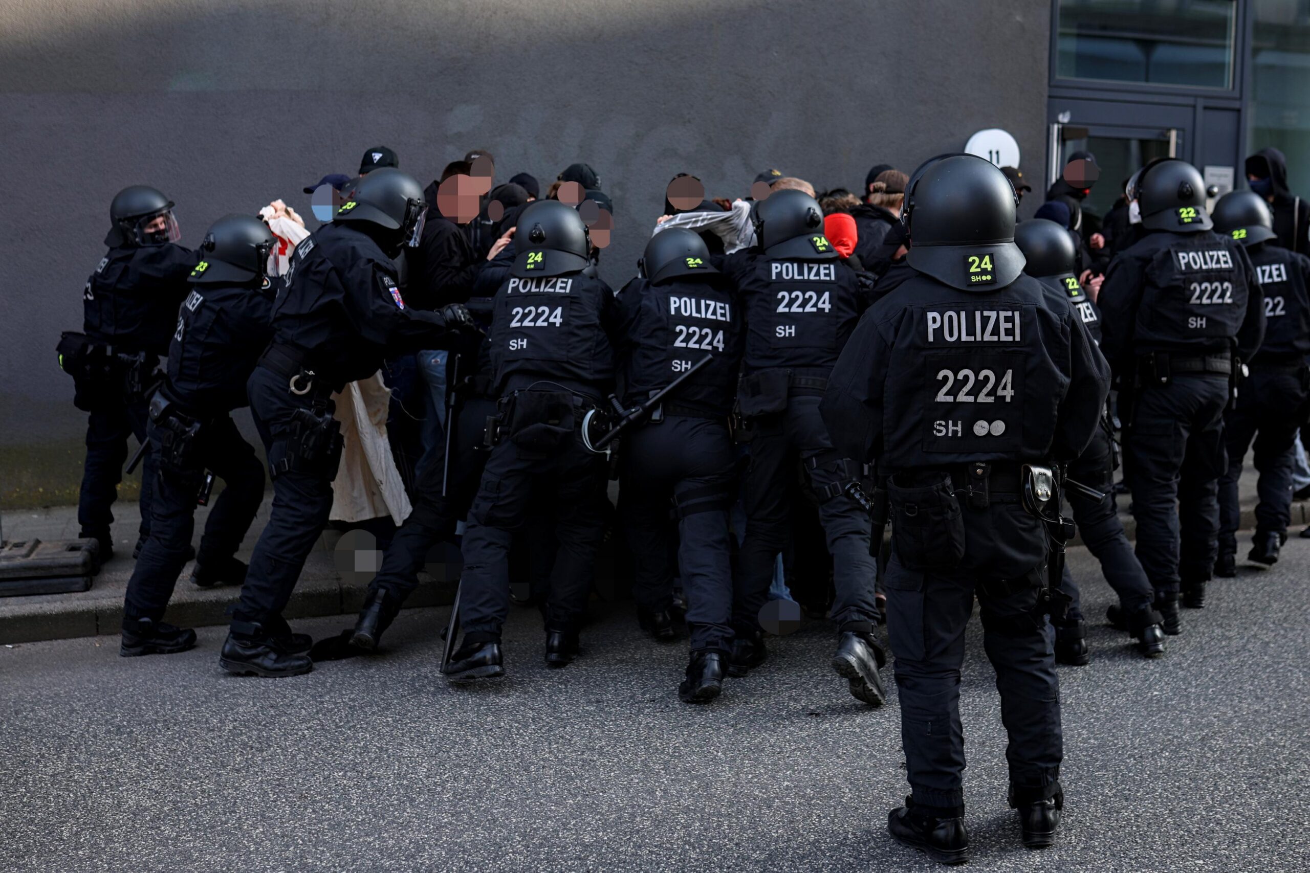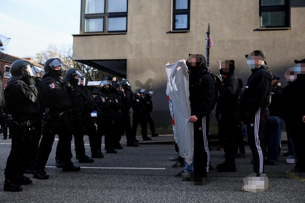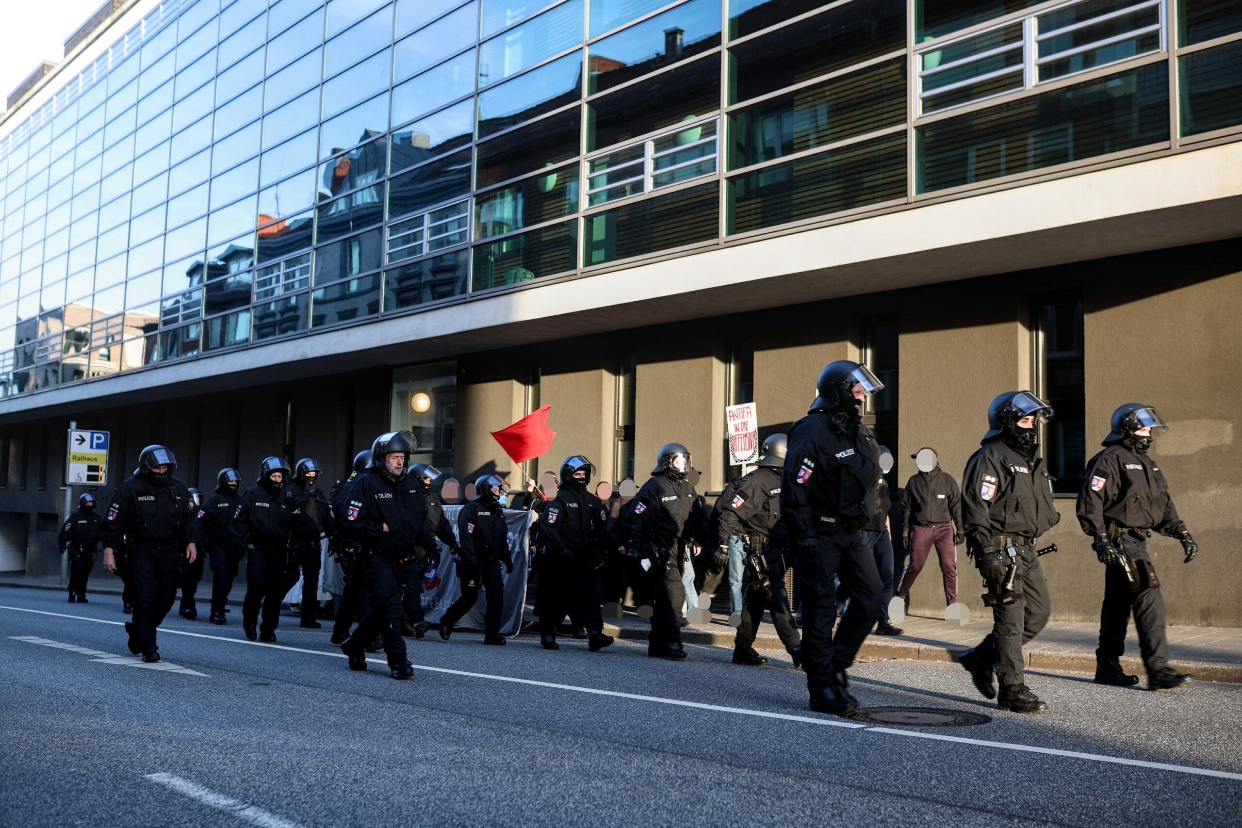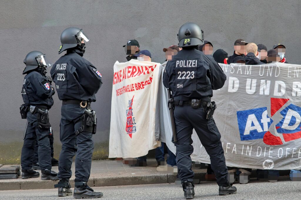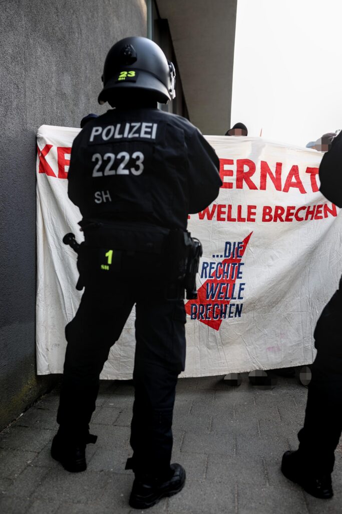 Besucher*innen für die AfD-Veranstaltung im Ratsaal blieben bis auf ein paar wenige aus. Unterdessen stellte die zweite Eutiner Einsatzhundertschaft mal wieder ihr Können in Puncto Eskalation und Gefährdung von Menschenleben unter Beweis: Eine Gruppe von Antifas, die sich am anderen Straßenende auf dem Gehweg positionieren wollte, wurde gewaltsam auf die befahrene Straße, geradewegs vor einen Bus geschubst und geschlagen. Mit einem riesigen, behelmten und behandschuhten Aufgebot verfolgten die Einsatzkräfte die Antifas daraufhin in bedrohlich (oder eben angesichts des Ablaufes geradezu peinlich) anmutendem Auftritt auf Schritt und Tritt, auch noch mehrere Minuten nach Auflösung und Beendigung der Versammlung.