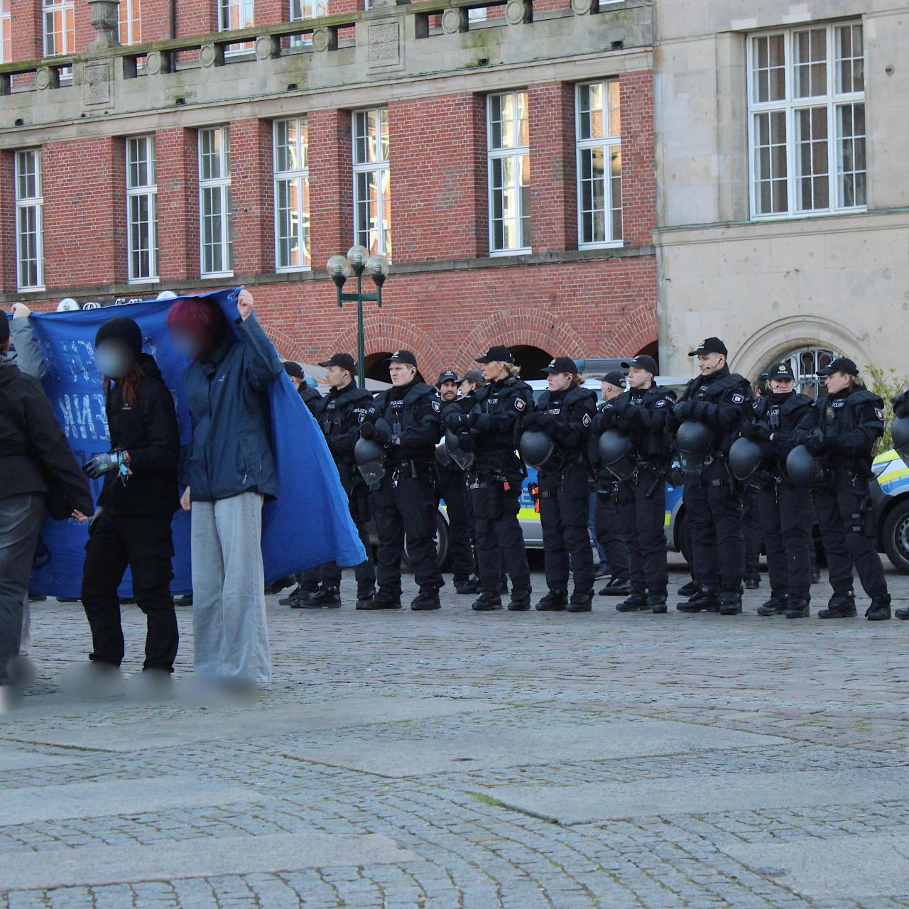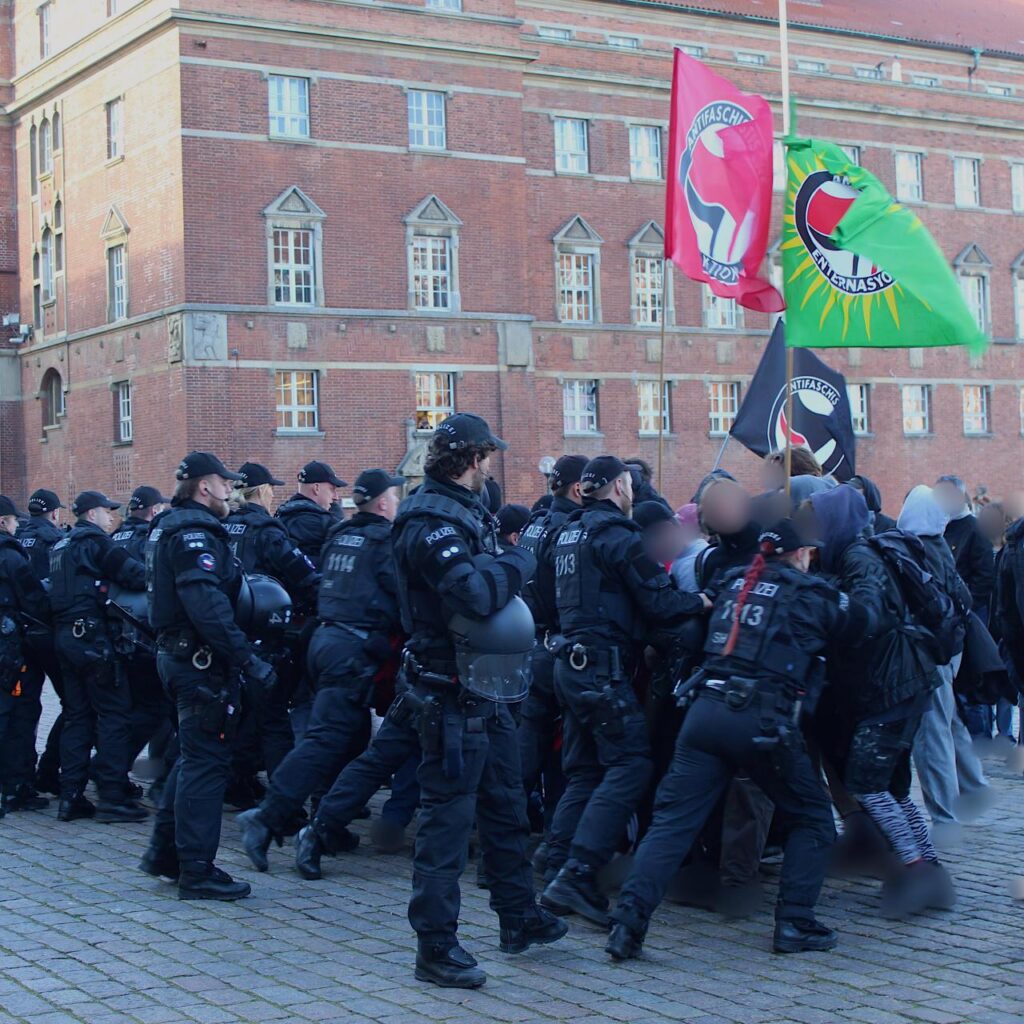 Dort versammelten sich am Nachmittag etwa 150 Antifaschist*innen beim Zugang zu den Parkplätzen am Hintereingang des Rathauses. Wie schon die letzten Male hatte die Polizei den Bereich zuvor mit Gittern und Ketten abgesperrt und sich mit großem Aufgebot auf dem Parkplatz zwischen Protest und Rathaus platziert. In mehreren Redebeiträgen wurden solidarische Grüße nach Flensburg geschickt, wo es genau wie in Kiel am vergangenen Osterwochenende zu rechten (Brand)angriffen auf den linksradikalen Laden Subtilus sowie auf mehrere Parteibüros kam. Als dann nach und nach die gerade einmal 13 Besucher*innen der AfD ankamen, wurden sie mit lauten Parolen ‚begrüßt‘.