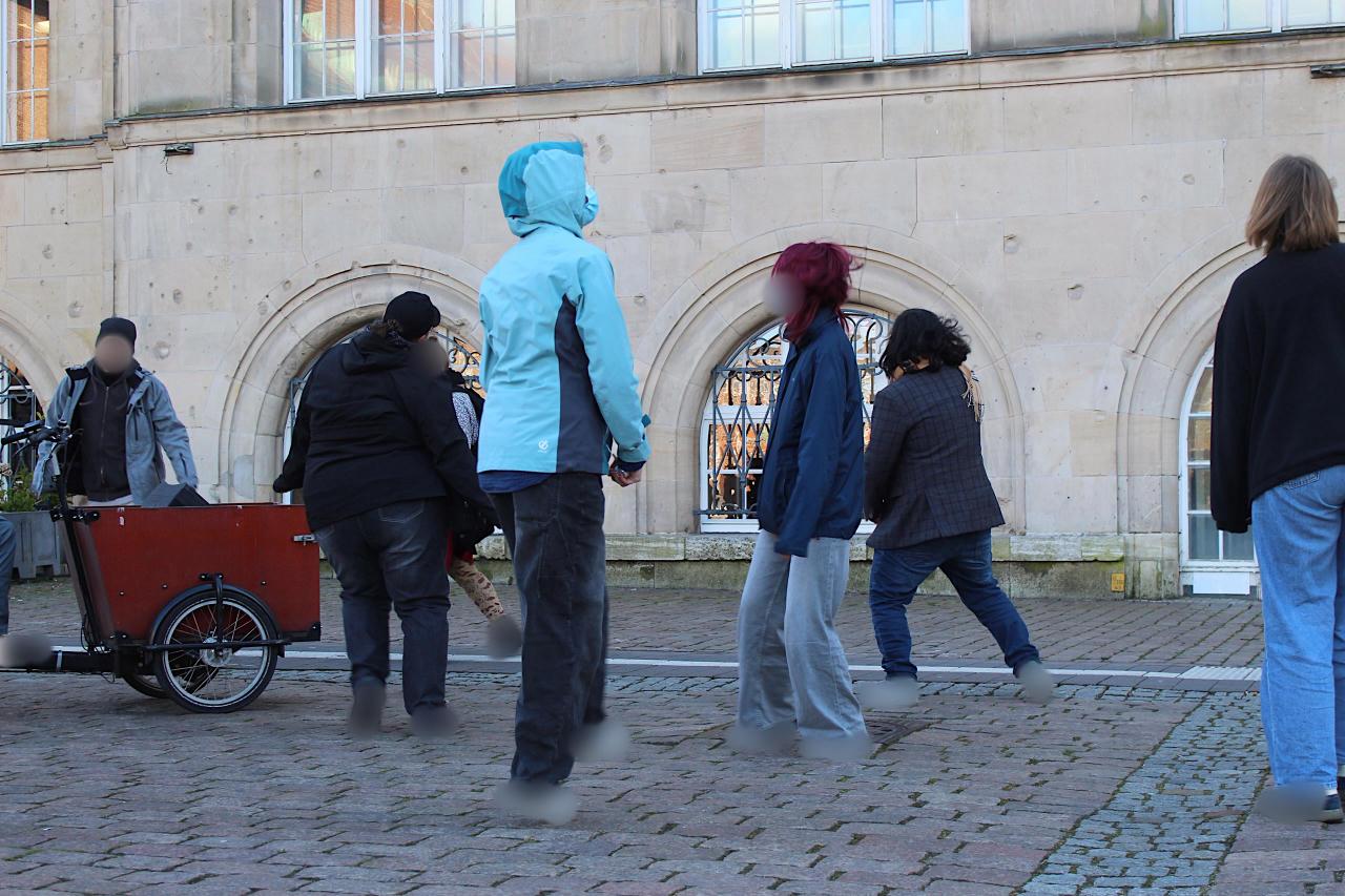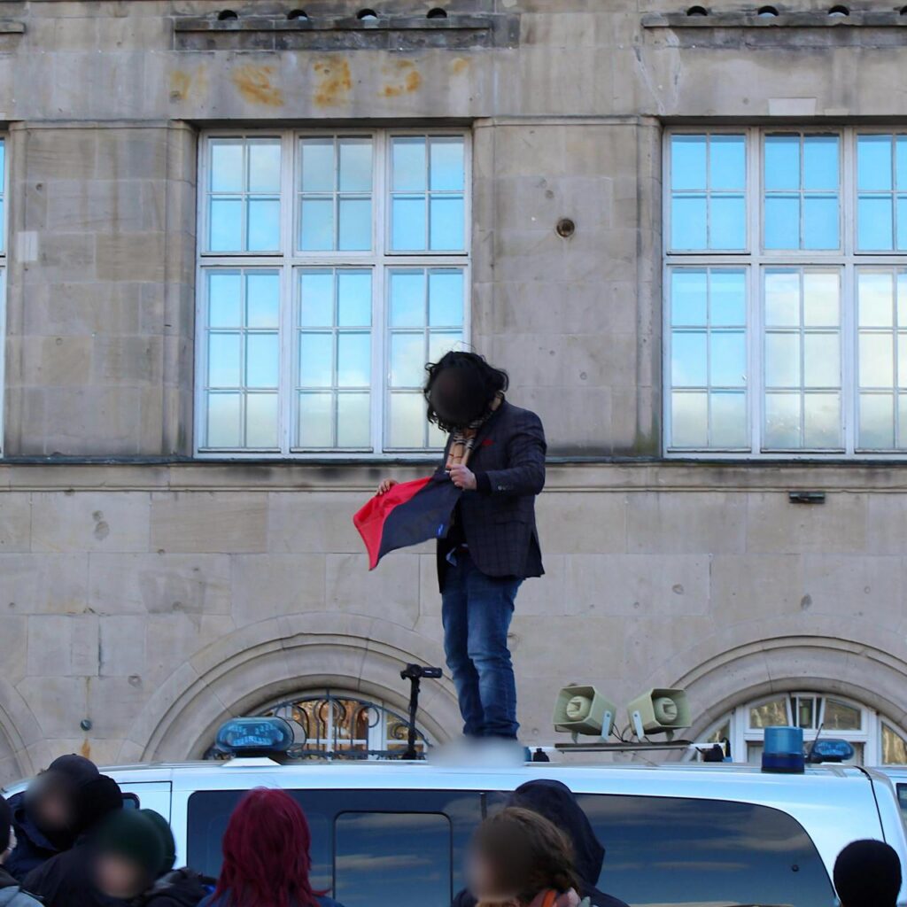 Zum Ende der Kundgebung hin sammelte sich unten auf dem Rathausplatz eine Gruppe Antifas, die spontan zur Musik eines Lautis anfing zu tanzen – unmittelbar unter dem Ratssaal in dem die AfD-Veranstaltung stattfand. Immer mehr Menschen gesellten sich dazu. Es dauerte eine gewisse Zeit, schließlich tauchte aber auch die Polizei auf und eskalierte mal wieder relativ unvermittelt. Die tanzenden Menschen wurden gewaltsam um einige Meter zurück gedrängt, ohne, dass es dafür einen erkennbaren Grund gab. Diese ließen sich davon jedoch nicht beirren und die tanzbare Fläche wurde um das Dach eines Polizeiwagens erweitert. Dies nahm die Polizei erneut zum Anlass gewalttätig zu werden. Eine Person wurde temporär festgesetzt um ihre Identität aufzunehmen. Im Anschluss löste sich die Versammlung rasch auf. Eine Kolonne an Polizeiautos verfolgte Antifas noch einige Zeit durch die Fußgänger*innenzone bevor sich alle Beteiligten ins Wochenende verabschieden konnten.